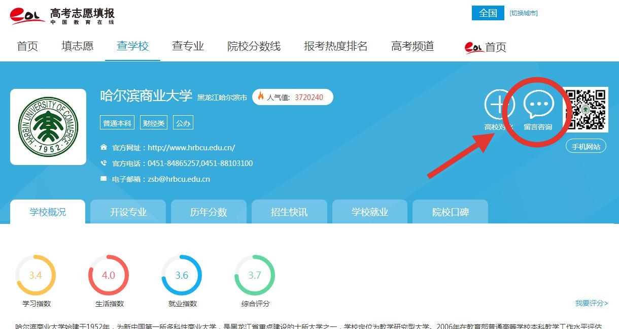 数据库中包含学校概况、历年分数、招生专业等招生信息,点击右上角“留言咨询”即可进入“招生e答”系统界面进行提问(下图)。同时扫描右上角二维码也可进入哈尔滨商业大学本科招生手机网站。