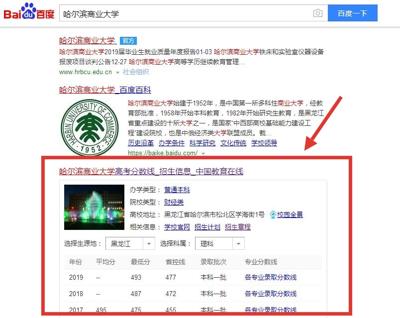 百度检索”哈尔滨商业大学”(下图),点击进入中国教育在线高考数据库。