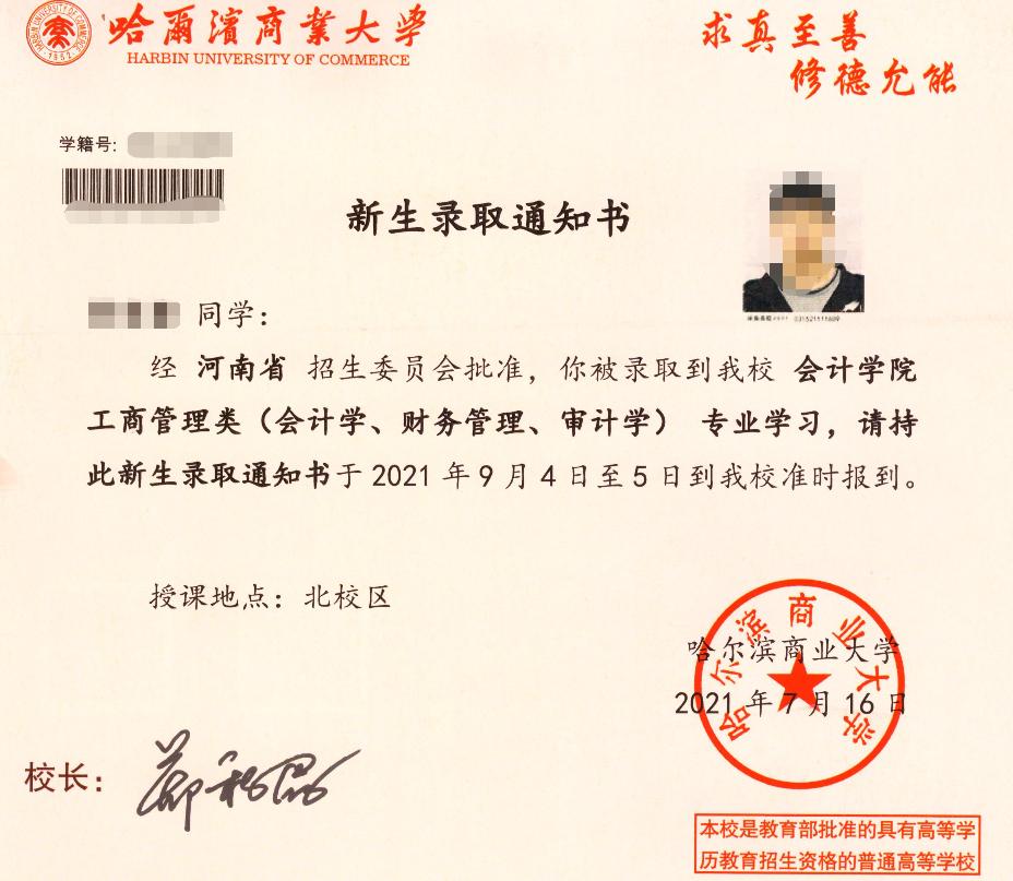 通知书可能会迟到,但一定不会缺席。个别地区如因受灾严重,开学前仍未收到录取通知书,新生可凭个人身份证及准考证直接来校报到。在多方援助下,相信坚强的河南人民一定能够尽快战胜灾情,我们在哈尔滨商业大学等你。